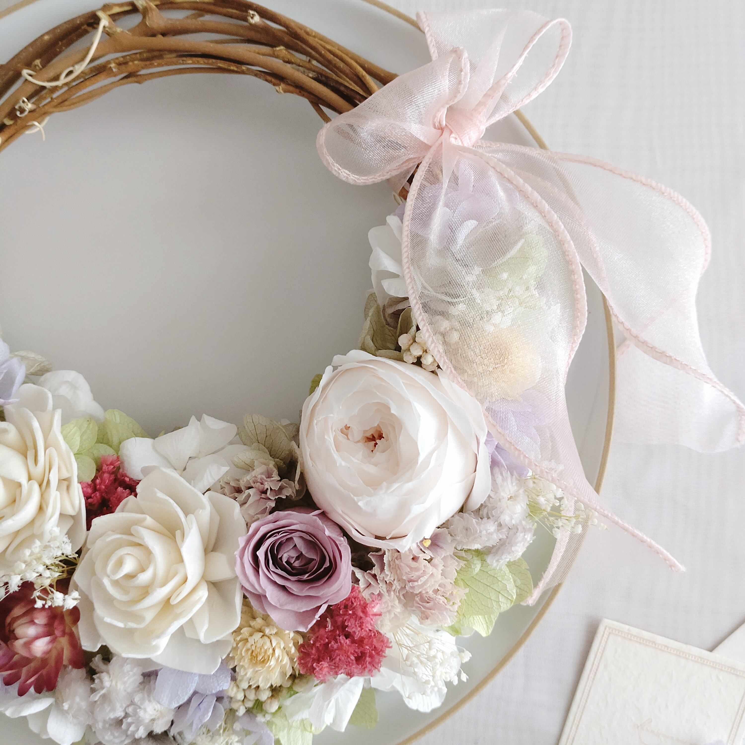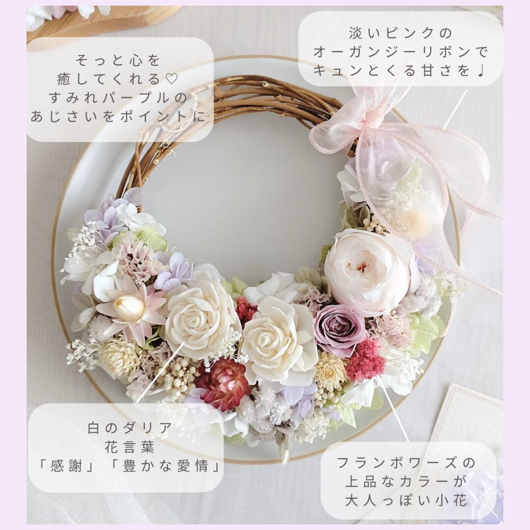どの角度から見ても満開の美しさを楽しめるリースです。